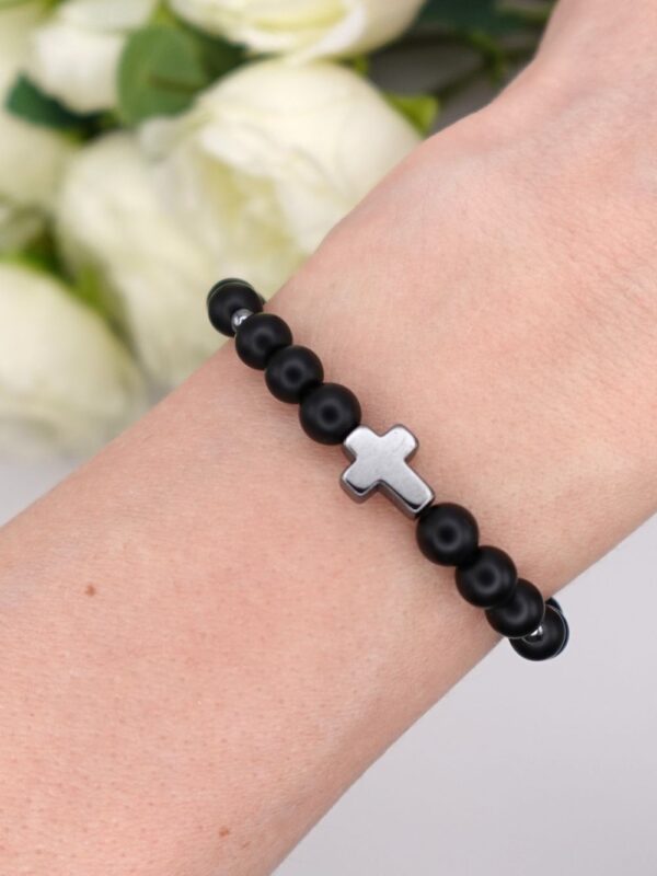 Bransoletka na Pierwszą Komunię Świętą z krzyżykiem z hematytu oraz koralikami z czarnego onyksu.