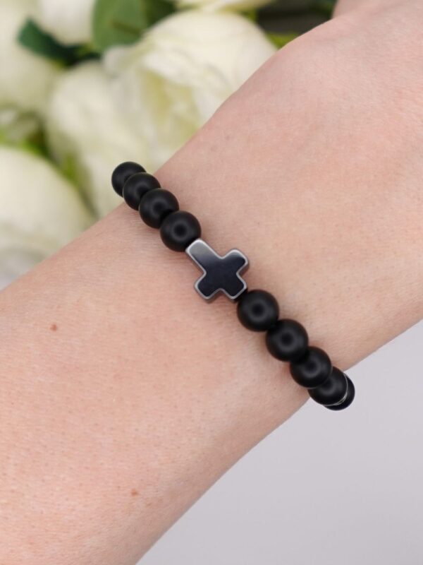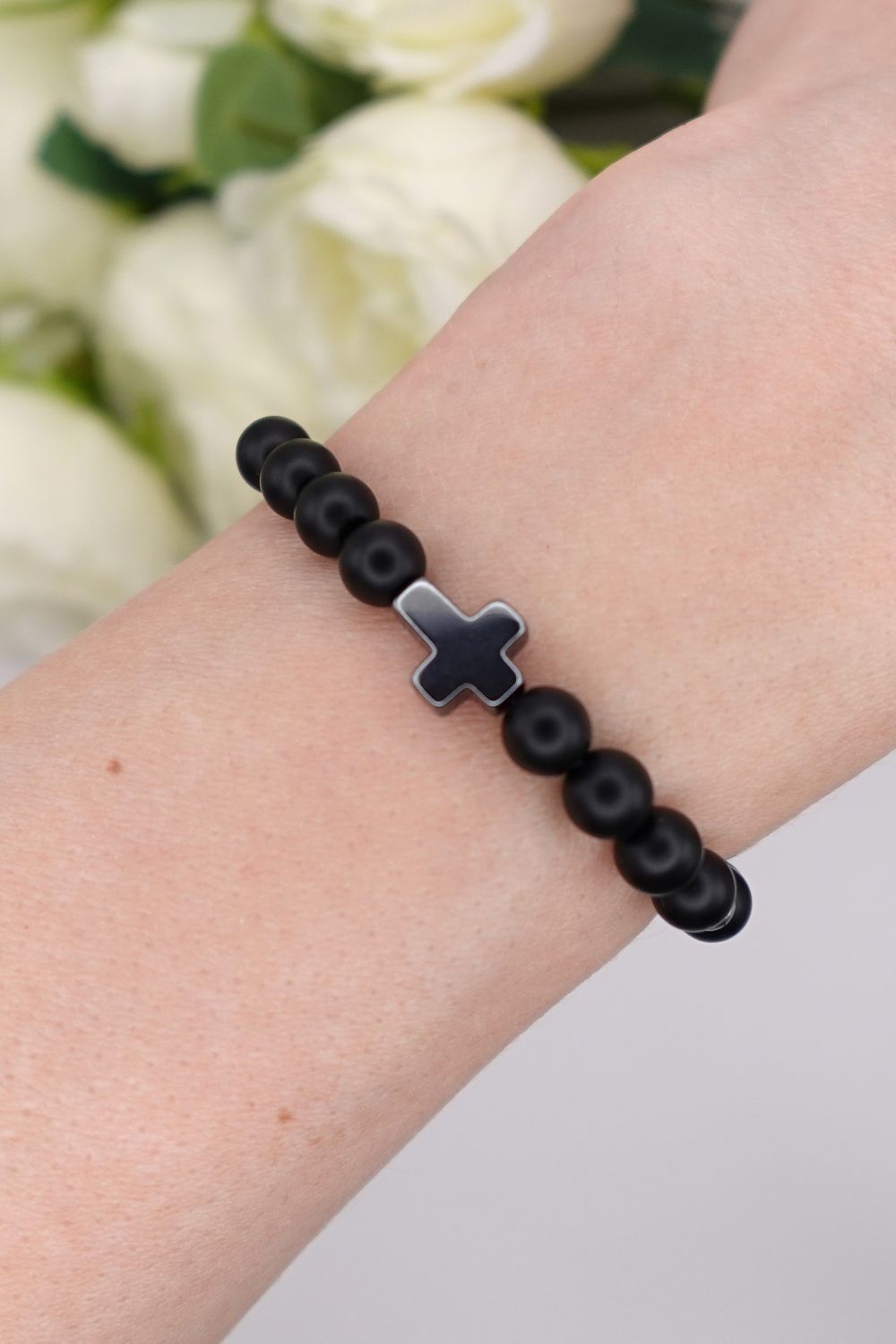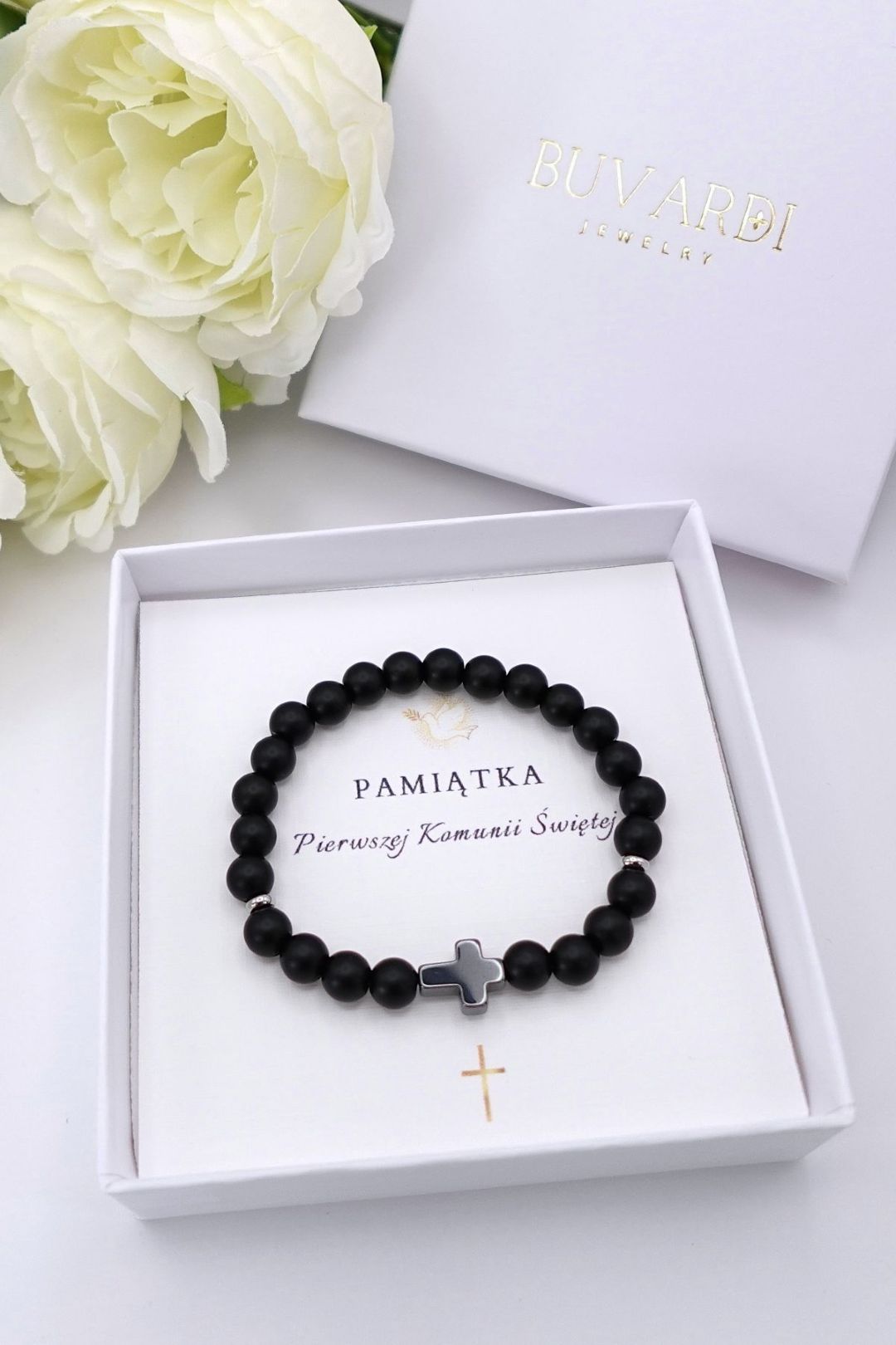 Bransoletka na Pierwszą Komunię Świętą z krzyżykiem z hematytu i onyksem.