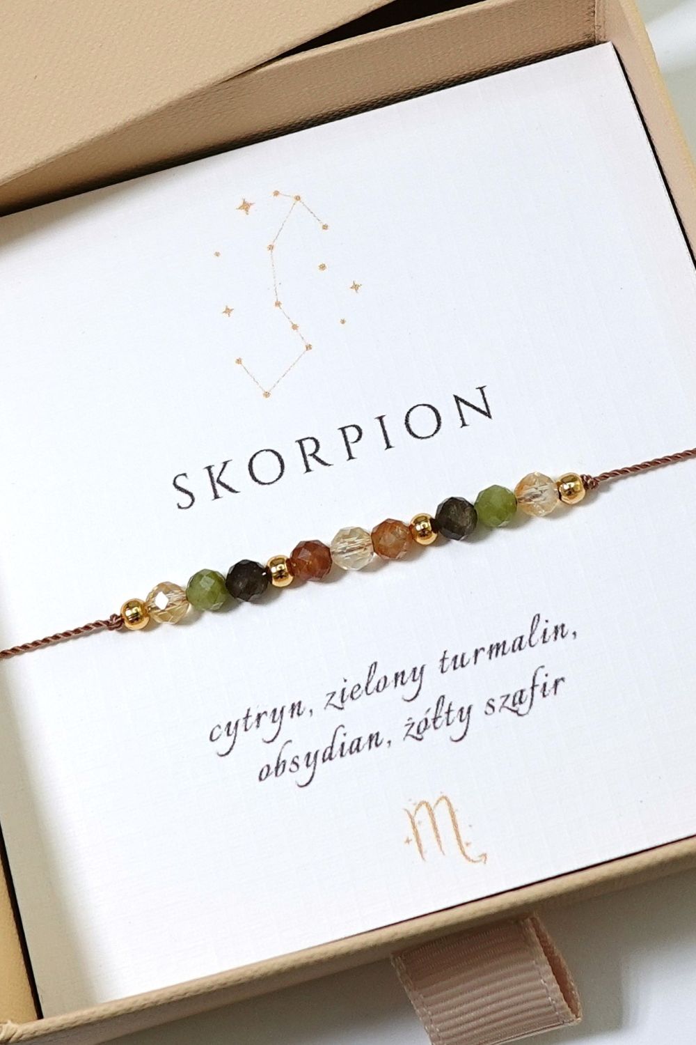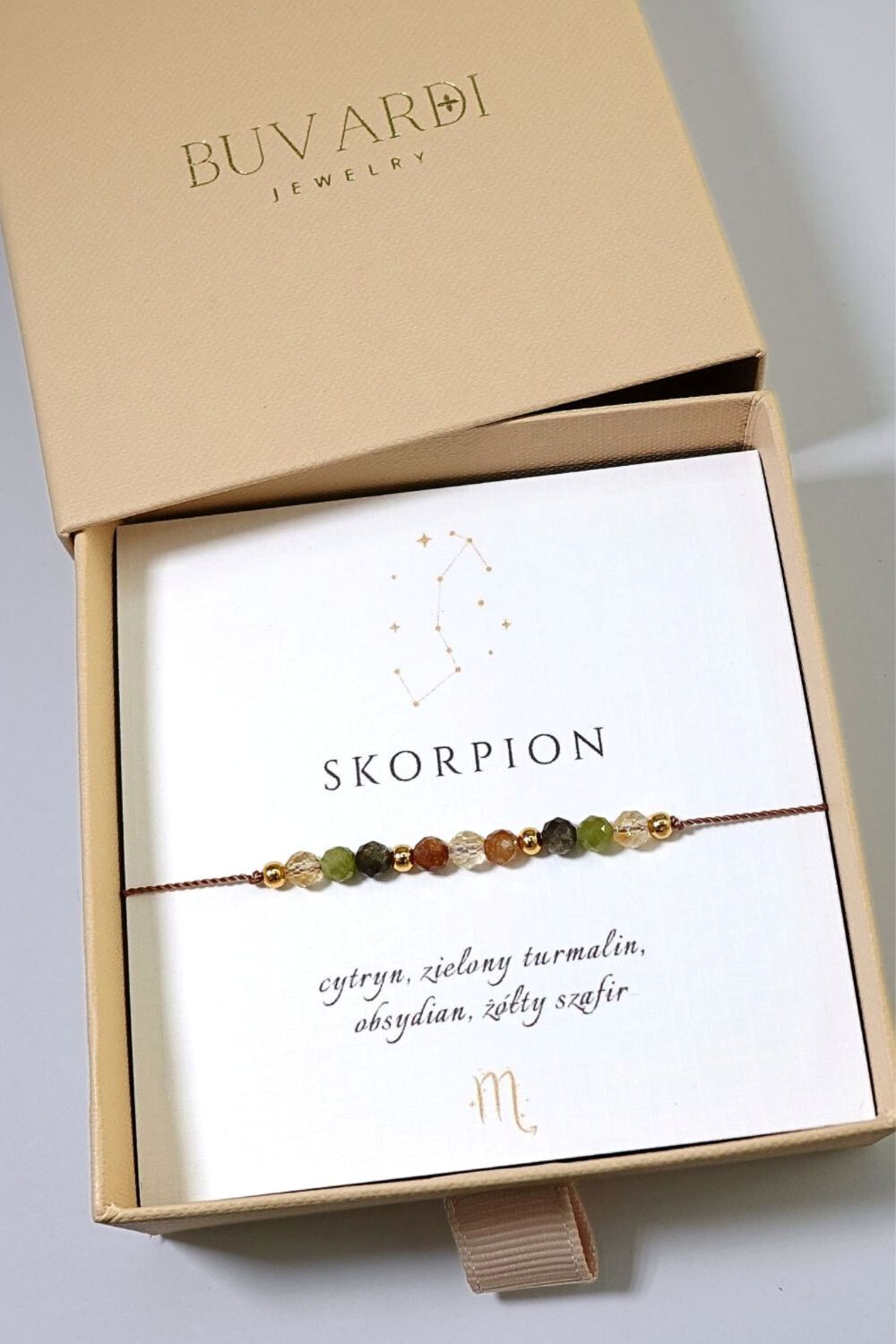 Bransoletka dla Skorpiona, łączy w sobie energię czterech wyjątkowych kamieni. Cytryn rozświetla codzienność i przyciąga sukces, zielony turmalin wzmacnia odwagę i wewnętrzną równowagę, żółty szafir inspiruje do działania, a obsydian chroni przed negatywnymi wpływami.