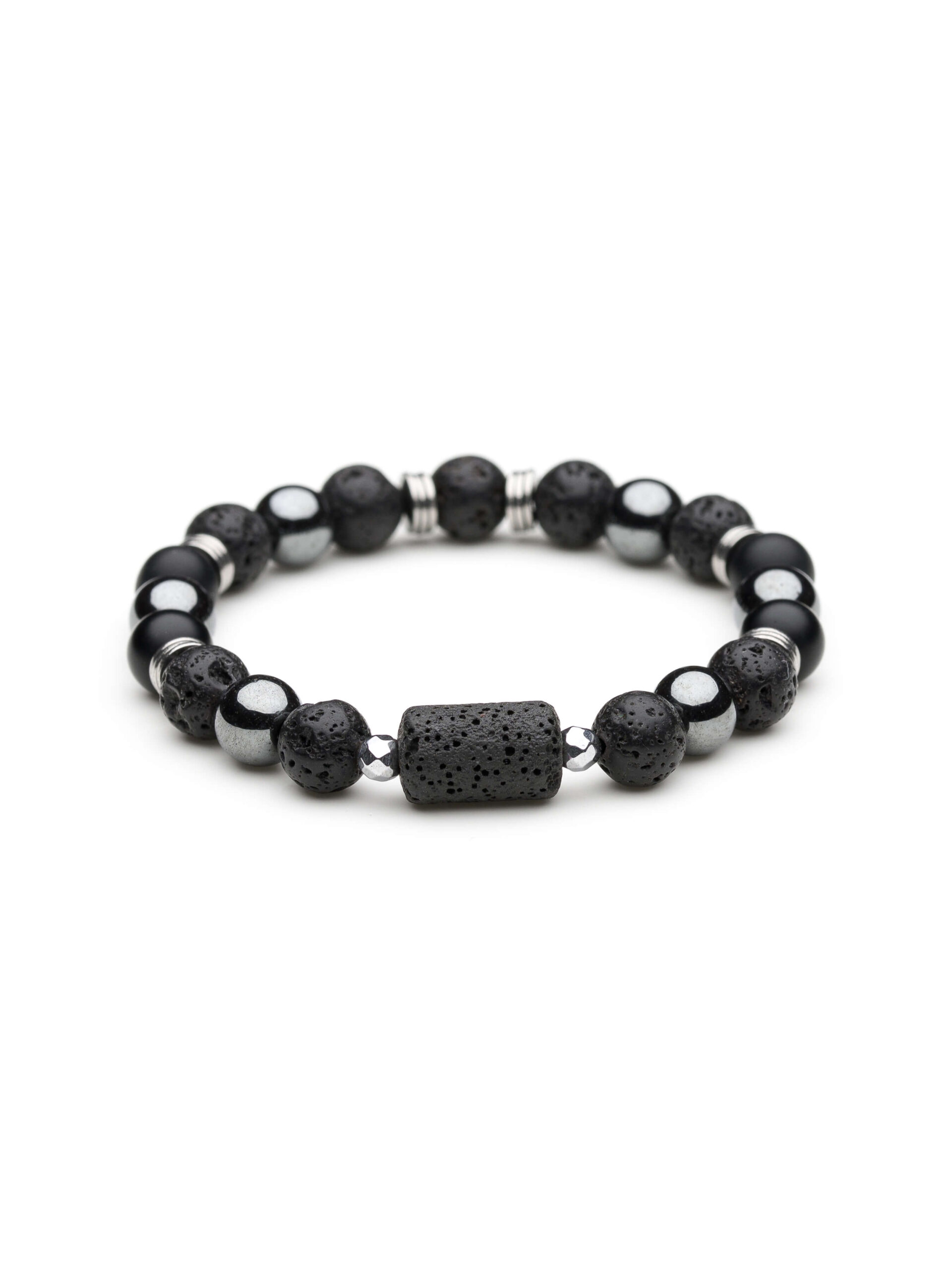 Bransoletka wyróżnia się surowym, zdecydowanie męskim charakterem. Matowe kamienie turmalinu połączono ze stalowymi akcentami, które dodają jej nowoczesności i wyrazistości. Hematyt wprowadza elegancki, metaliczny połysk, a lawa wulkaniczna swoją naturalną, porowatą strukturą podkreśla surowość i siłę, tworząc mocny i ponadczasowy styl.