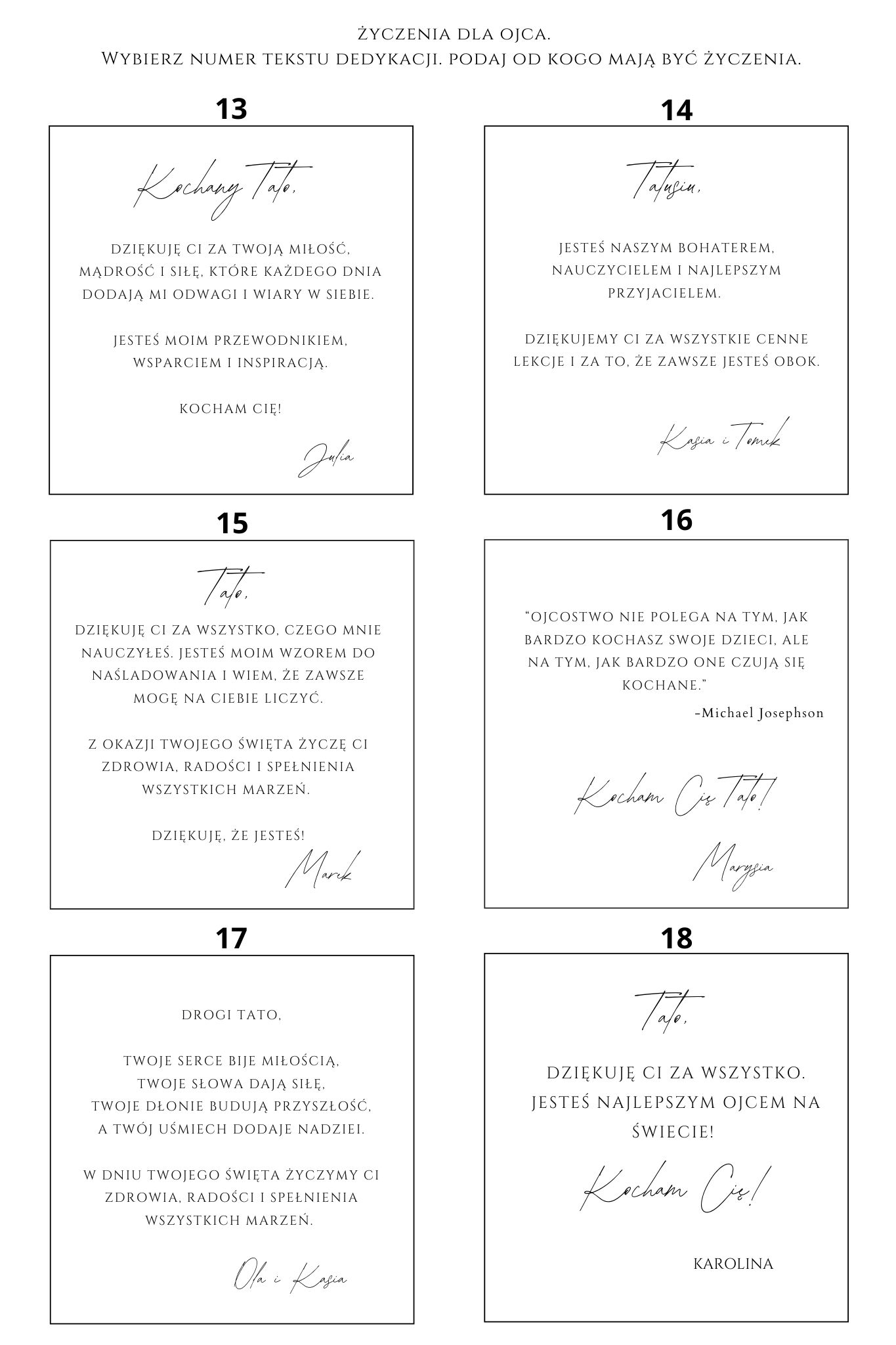 Bransoletkę możesz zakupić z dodatkową karteczką z życzeniami dla obdarowywanej osoby. Do wyboru masz możliwość dodania własnej treści dedykacji albo skorzystanie z przygotowanych przez nas tekstów. W polu tekstowym wpisz treść dedykacji lub numer gotowego tekstu. Podaj imię osoby, dla której są życzenia oraz podpis. Bransoletka z dedykacją to najlepszy pomysł na prezent.