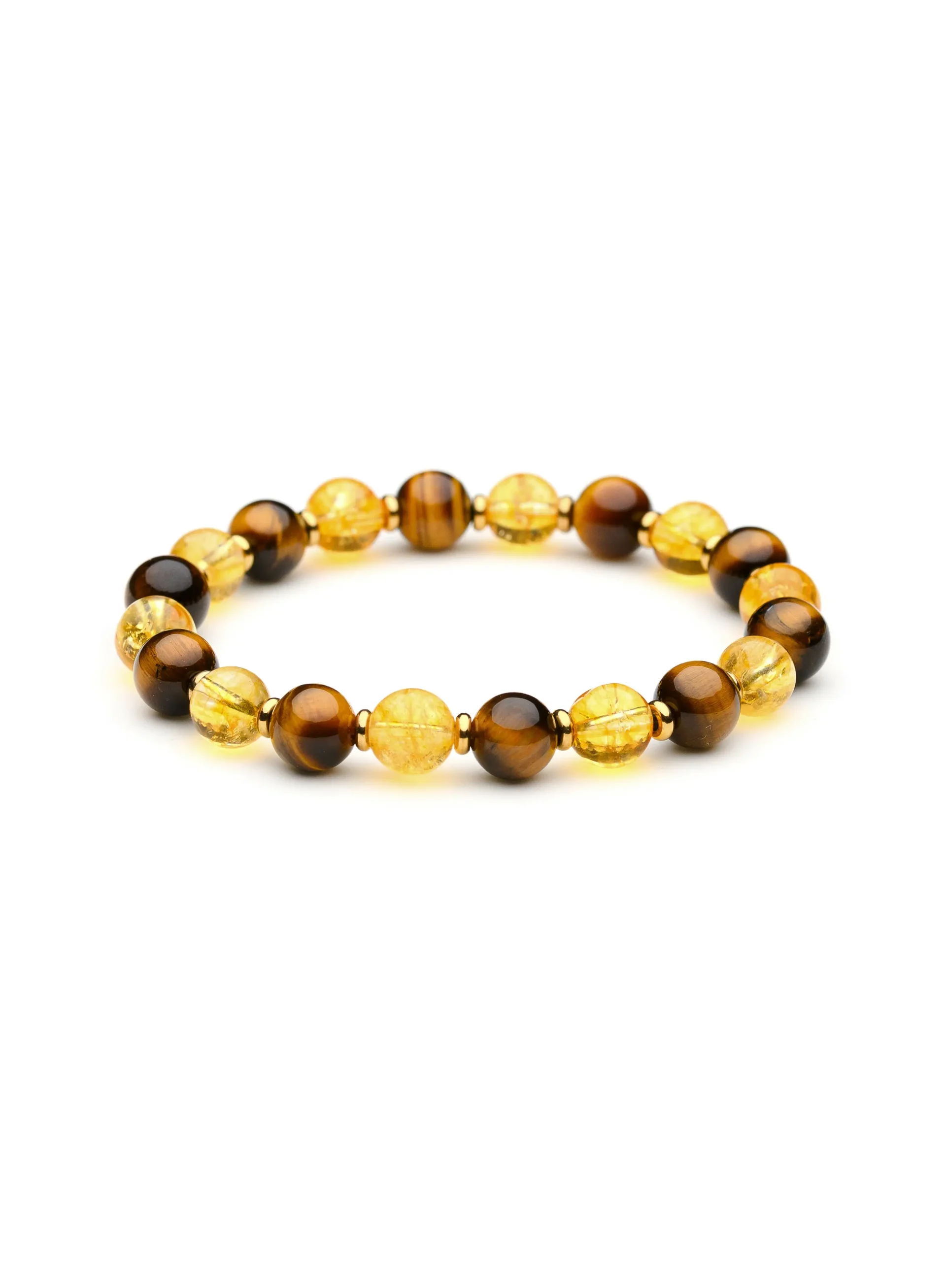 Połączenie ciepłych złoto-brązowych tonów tworzy ponadczasową, męską estetykę — elegancką, a jednocześnie silnie osadzoną w naturalnym charakterze kamieni. Bransoletka świetnie prezentuje się zarówno na co dzień, jak i w bardziej formalnych stylizacjach, dodając im wyrazistości i energii.