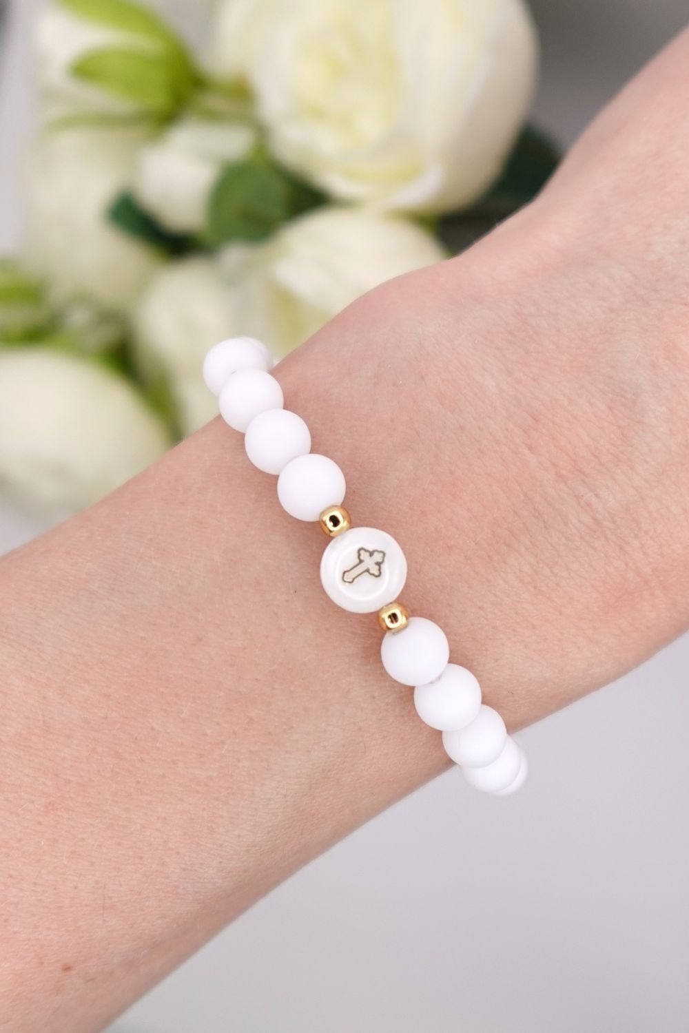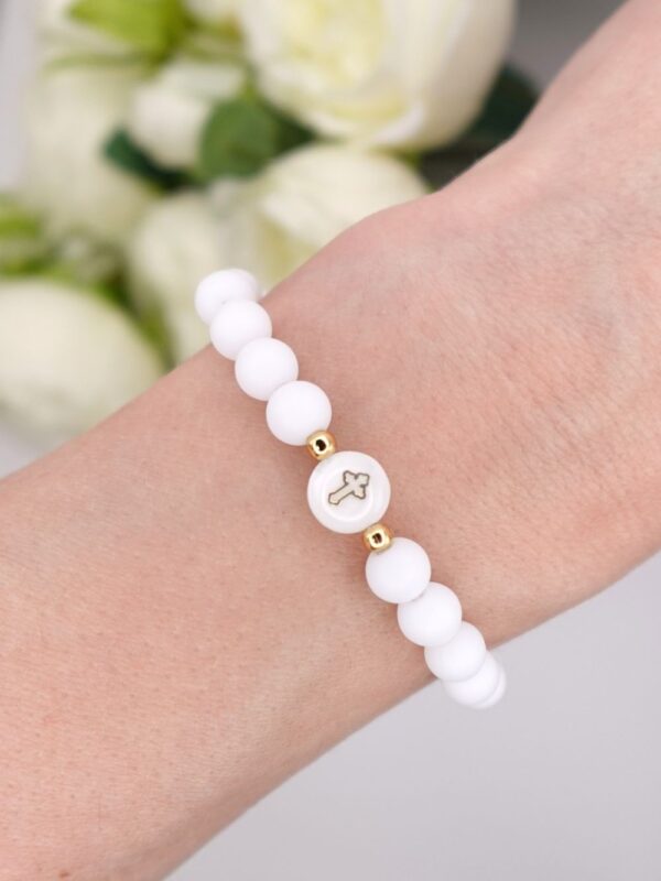 Bransoletka na Pierwszą Komunię Świętą z koralikiem z masy perłowej oraz koralikami z białego agatu.