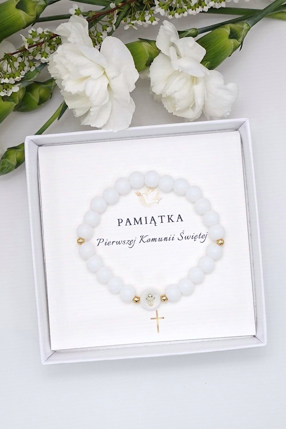 Bransoletkę pakujemy w eleganckie białe pudełko na biżuterię z logo firmy w złotym kolorze. Dodatkowo, w cenie bransoletki, dołączona jest karteczka z życzeniami na Pierwszą Komunię Świętą, której tekst możesz wybrać z przygotowanych przez nas propozycji. Możesz też podać nam własny tekst życzeń, a my umieścimy je na karteczce z bransoletką. Twoje zamówienie wysyłamy w ciągu 24 godzin, aby dotarło do Ciebie jak najszybciej.