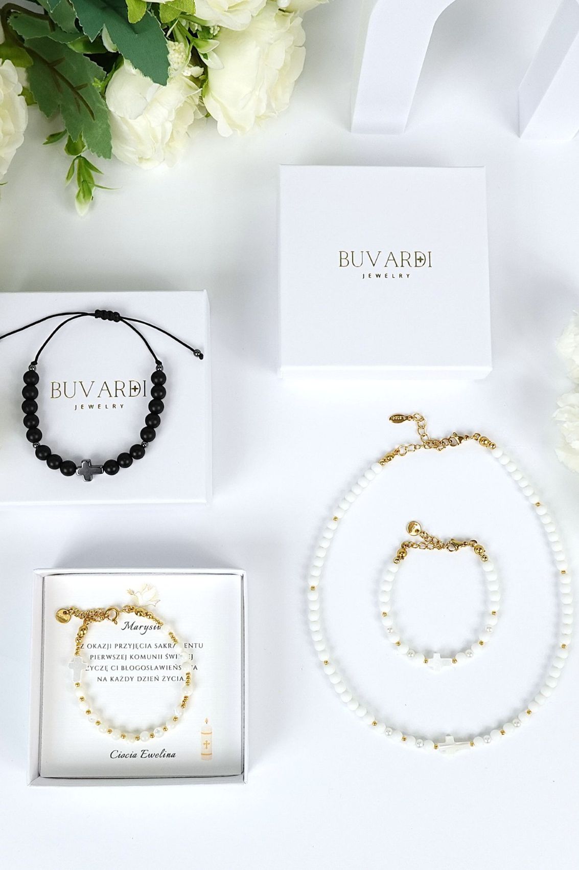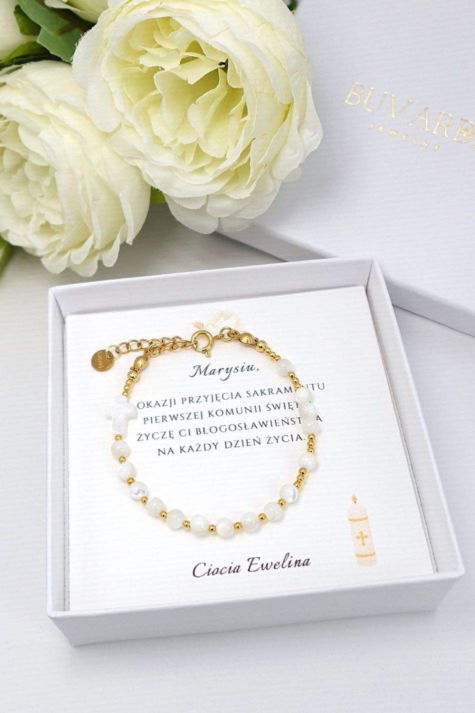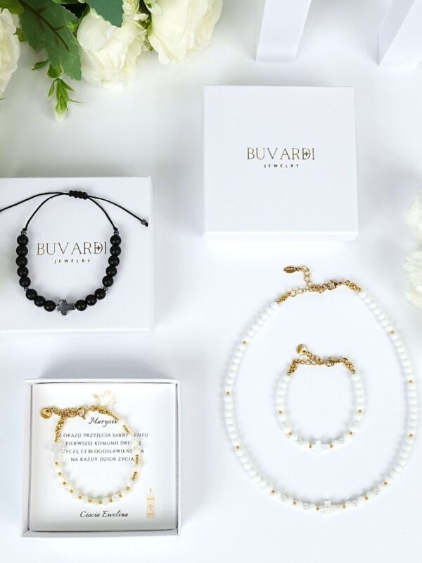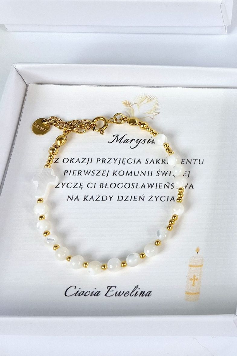 Bransoletkę pakujemy w eleganckie białe pudełko na biżuterię z logo firmy w złotym kolorze. Dodatkowo, w cenie bransoletki, dołączona jest karteczka z życzeniami na Pierwszą Komunię Świętą, której tekst możesz wybrać z przygotowanych przez nas propozycji. Możesz też podać nam własny tekst życzeń, a my umieścimy je na karteczce z bransoletką. Twoje zamówienie wysyłamy w ciągu 24 godzin, aby dotarło do Ciebie jak najszybciej.