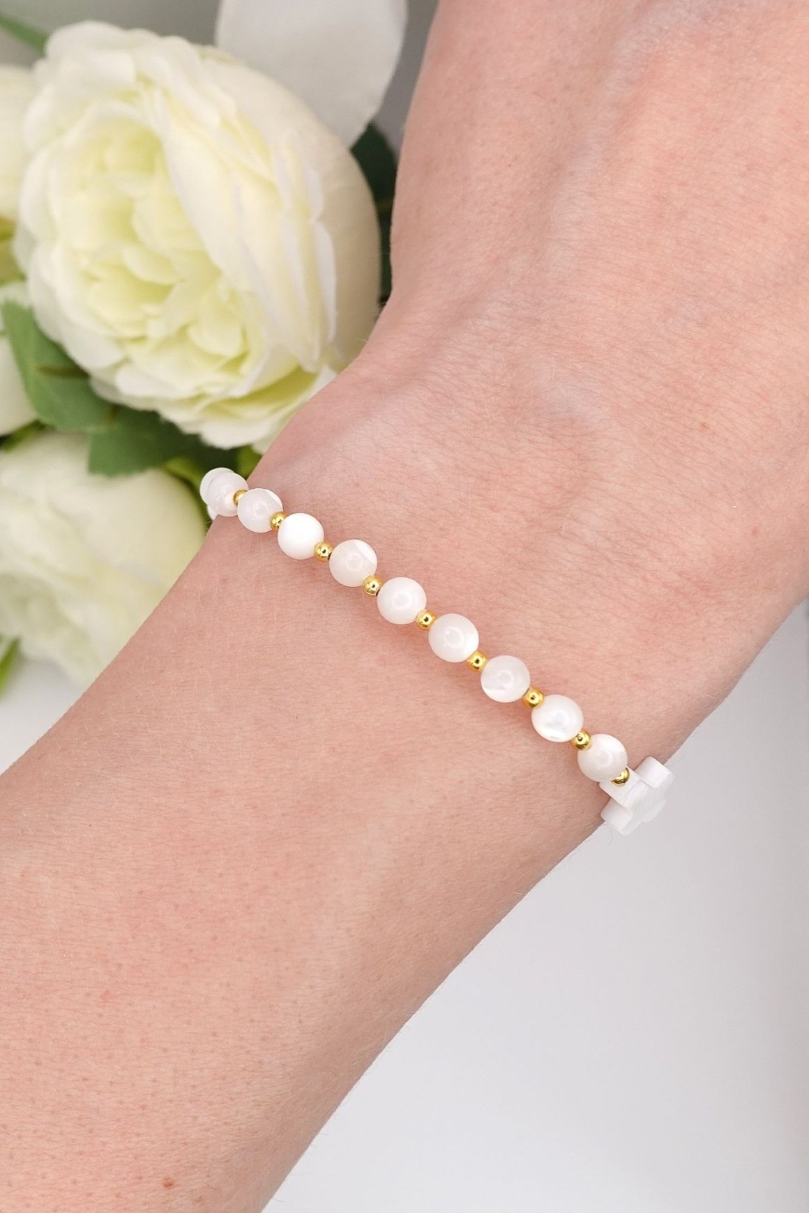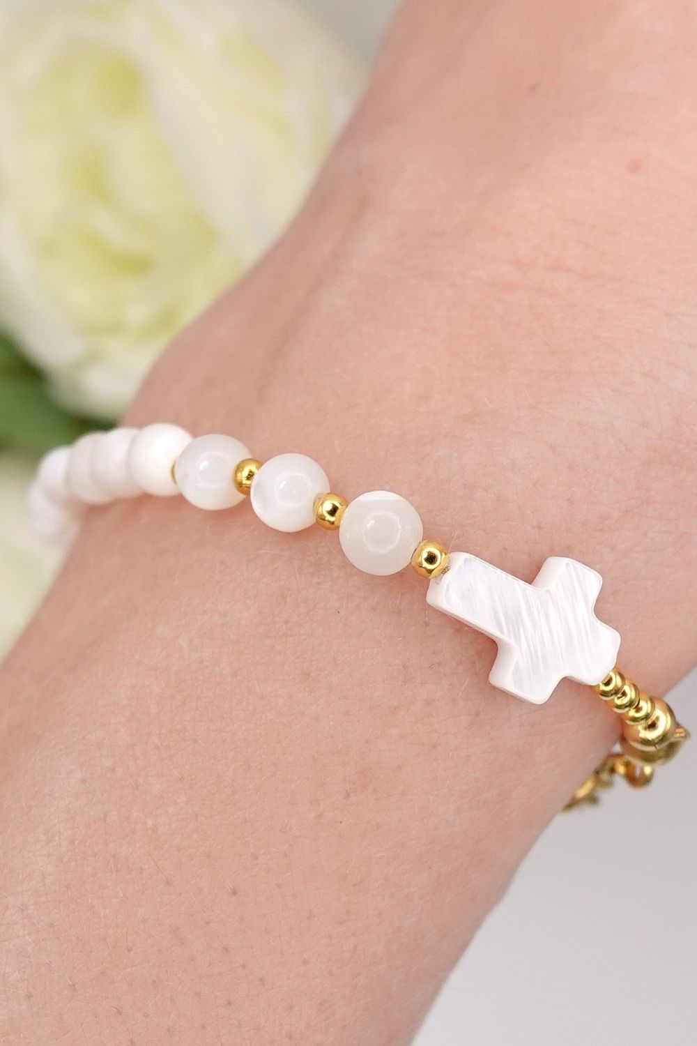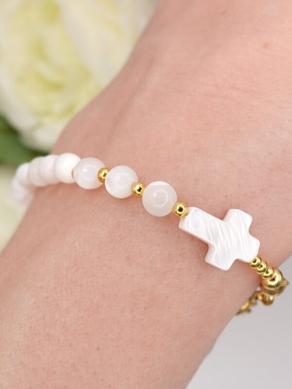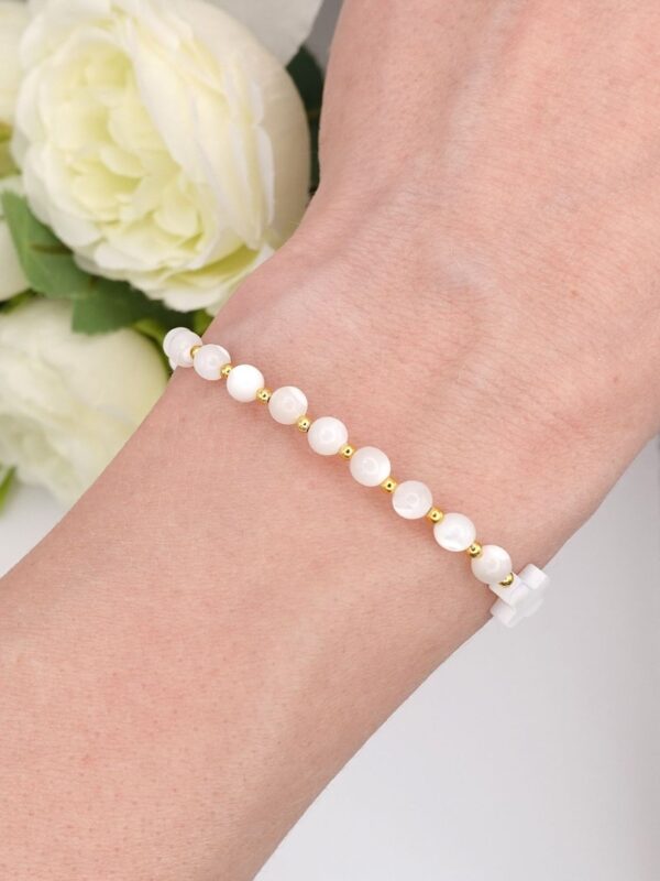 Bransoletka różaniec dla dziewczynki na Pierwszą Komunię Świętą z krzyżykiem i koralikami z masy perłowej.