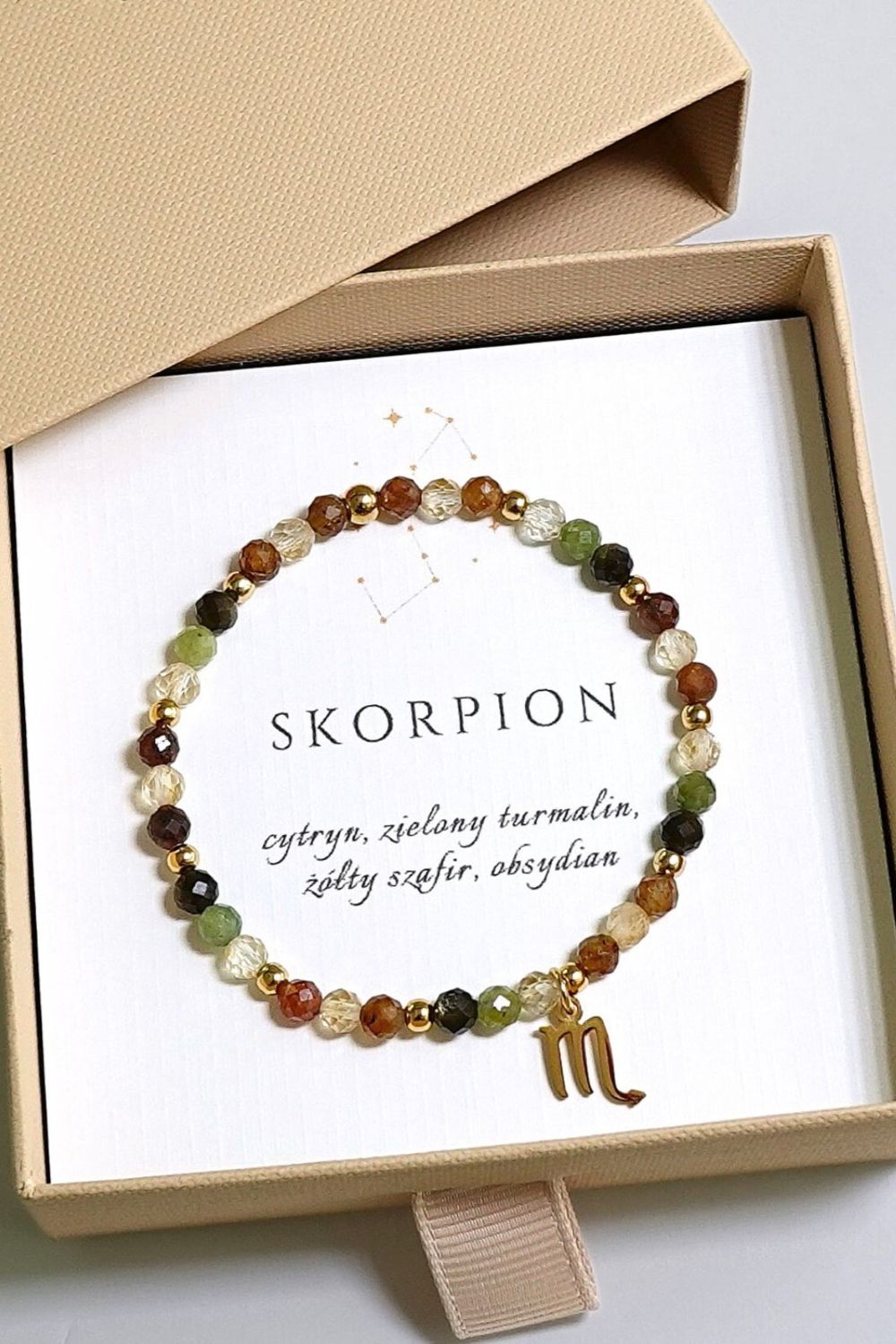 Bransoletka ta powstała z myślą o osobach urodzonych pod znakiem Skorpiona (23.10 – 21.11). Skorpion to znak zodiaku pełen pasji, siły wewnętrznej i intensywności emocji. Skorpion jest znakiem intensywnym, tajemniczym i głęboko emocjonalnym, dlatego kamienie przypisane do tego znaku pomagają mu w utrzymaniu równowagi emocjonalnej oraz pomagają zharmonizować intensywną energię.