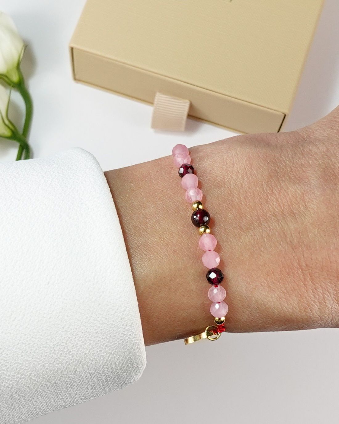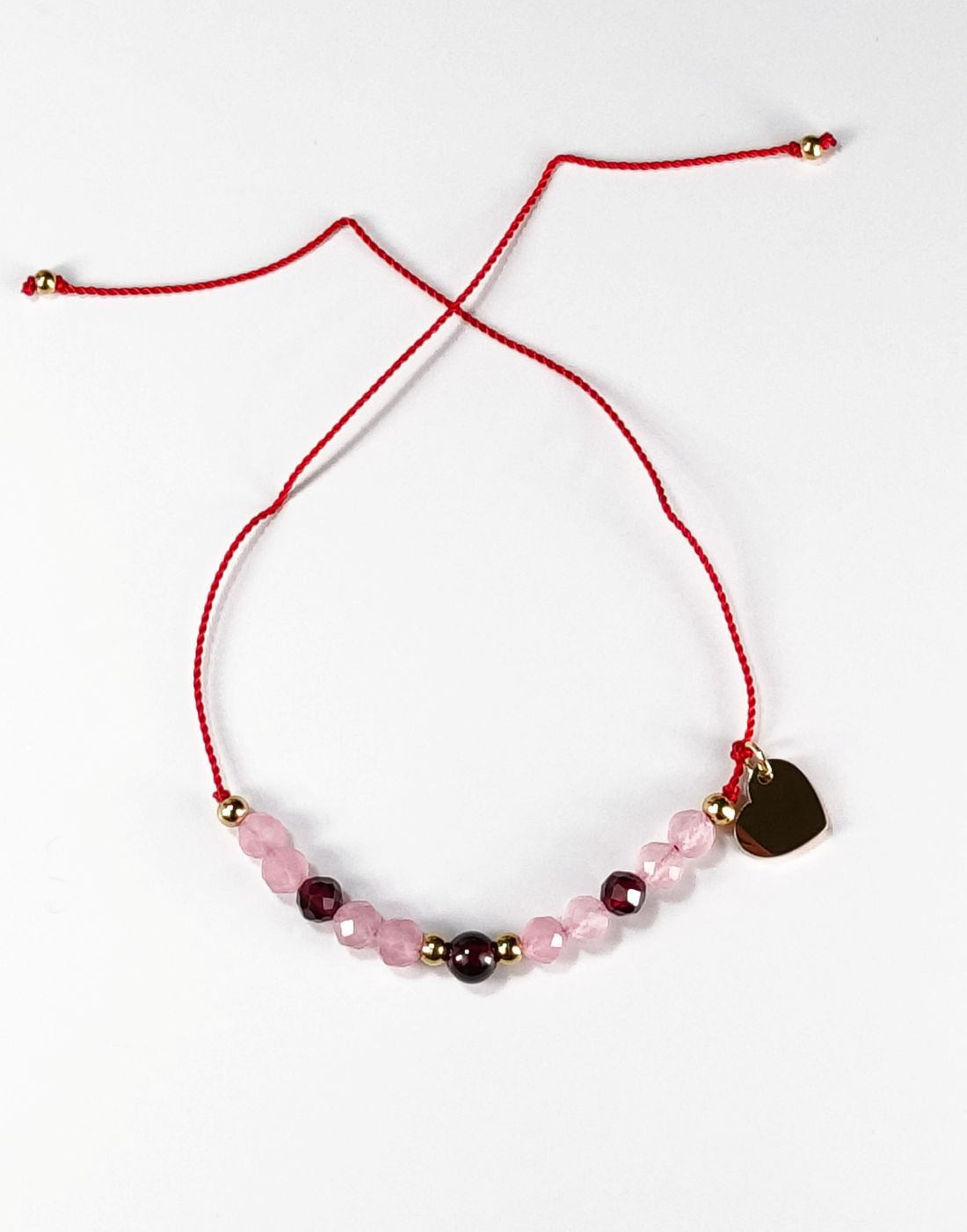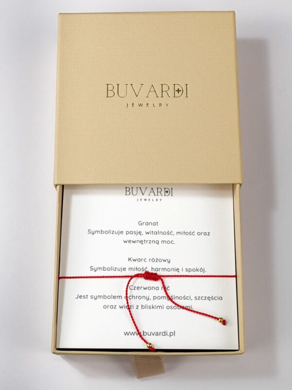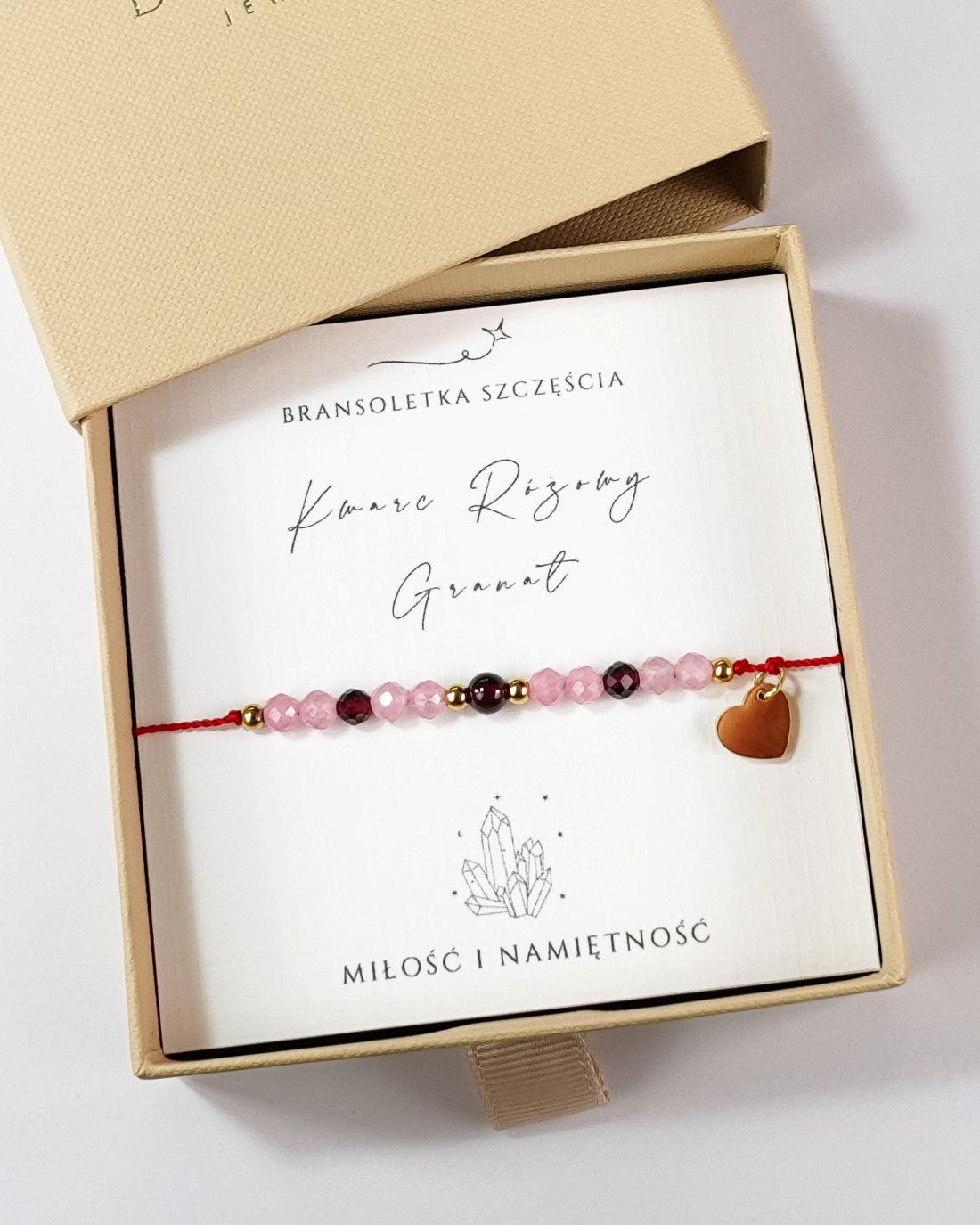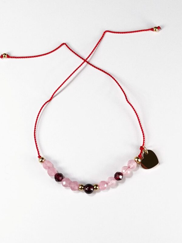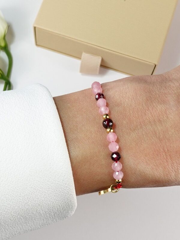 Bransoletka Szczęścia na miłość z różowym kwarcem i granatem na czerwonym sznurku to subtelny symbol miłości i pasji, który pomaga otworzyć serce na ciepło, bliskość i szczęście. Czerwony sznurek od wieków uznawany jest za amulet ochronny, przyciągający szczęście i odpierający negatywną energię. Symbolizuje życie, miłość i ochronę duchową.