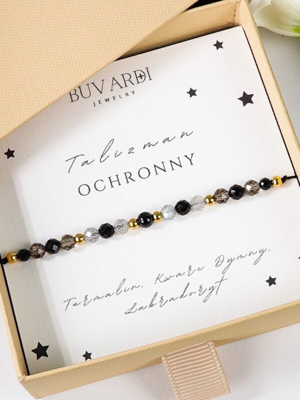 Bransoletka „Talizman Ochronny” z turmalinem, kwarcem dymnym i labradorytem – na sznurku