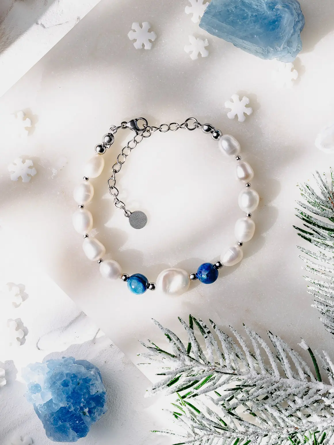 Bransoletka z pereł z kianitem świetnie sprawdzi się jako dodatek do eleganckich zimowych zestawów, stylizacji świątecznych, ale również jako ciekawy akcent do codziennych outfitów.