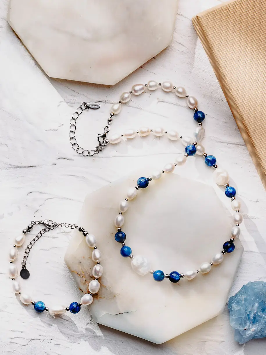 Połączenie pereł z kianitem tworzy kompozycję o wyraźnie zimowym charakterze — subtelną, chłodną i pełną wyważonego blasku. Niebieski odcień kianitu przywodzi na myśl przejrzyste, mroźne powietrze, podczas gdy perły dodają całości miękkiej, świetlistej harmonii. Razem tworzą biżuterię, która zachwyca spokojem zimowych barw i elegancją