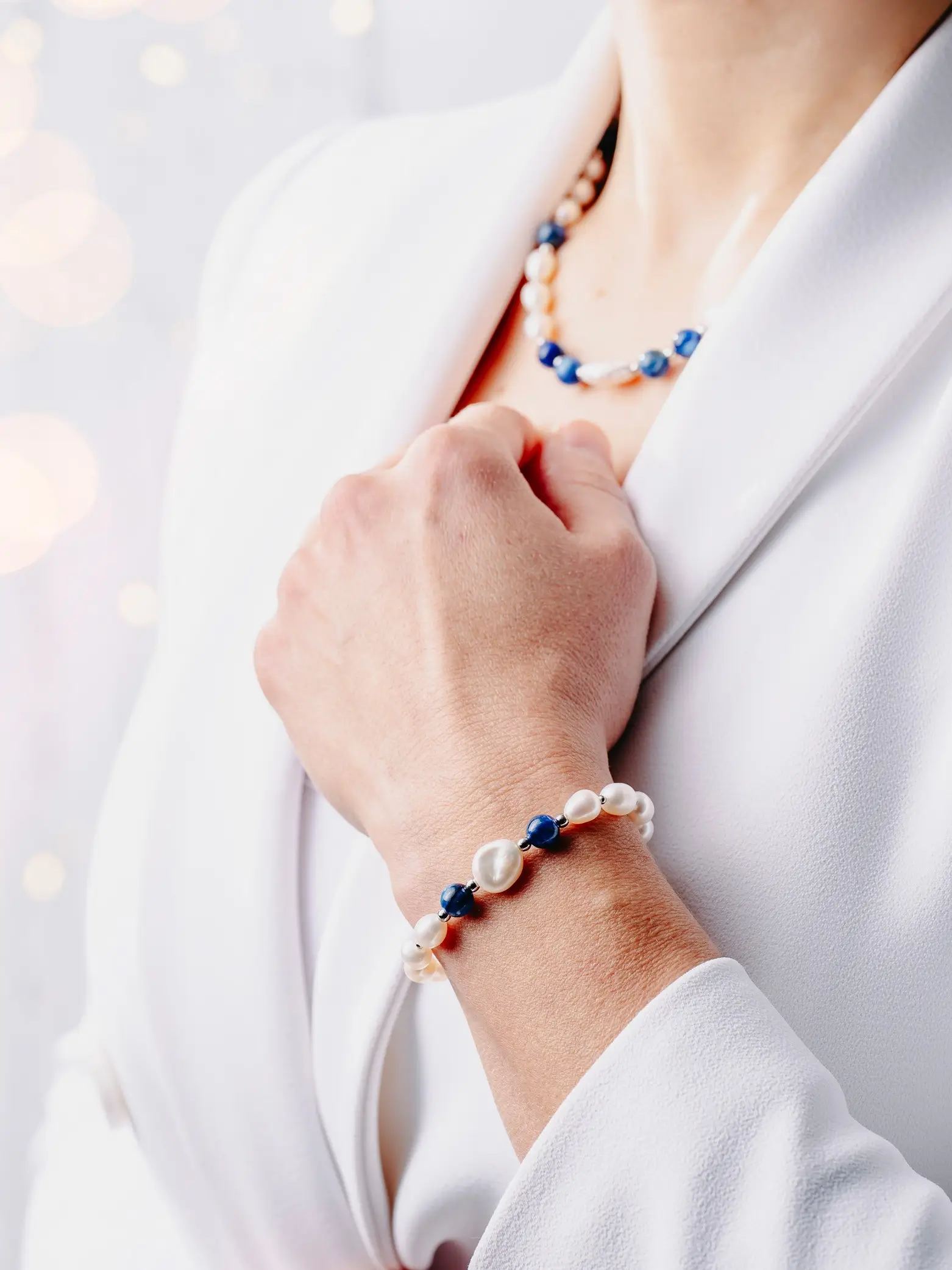 Bransoletka została stworzona z dużych pereł słodkowodnych, szlachetnego kianitu w chłodnym odcieniu błękitu oraz centralnie osadzonej, imponującej perły barokowej. Połączenie gładkich pereł z naturalnie nieregularną barokową formą nadaje biżuterii wyjątkową elegancję i niepowtarzalny charakter.