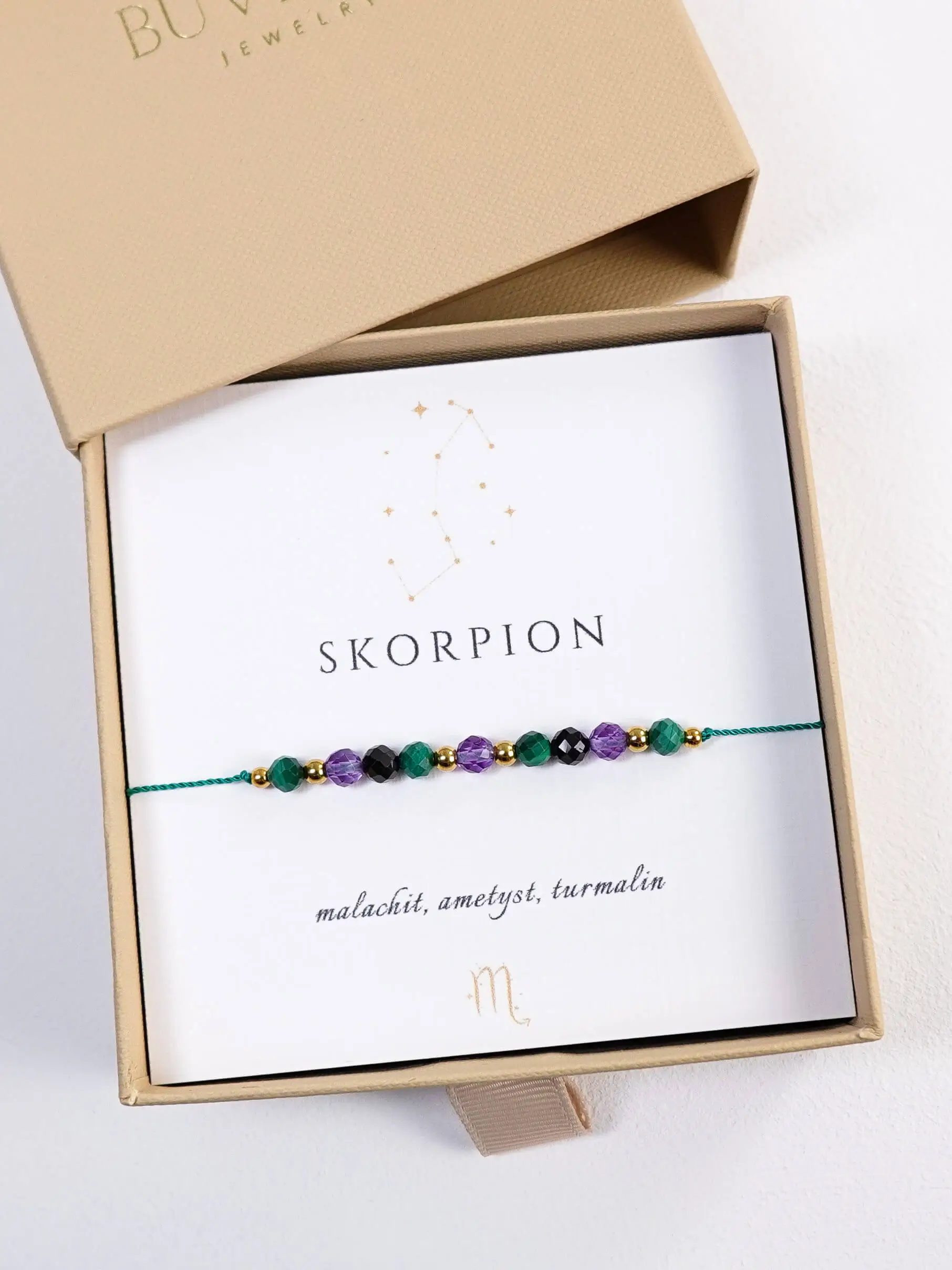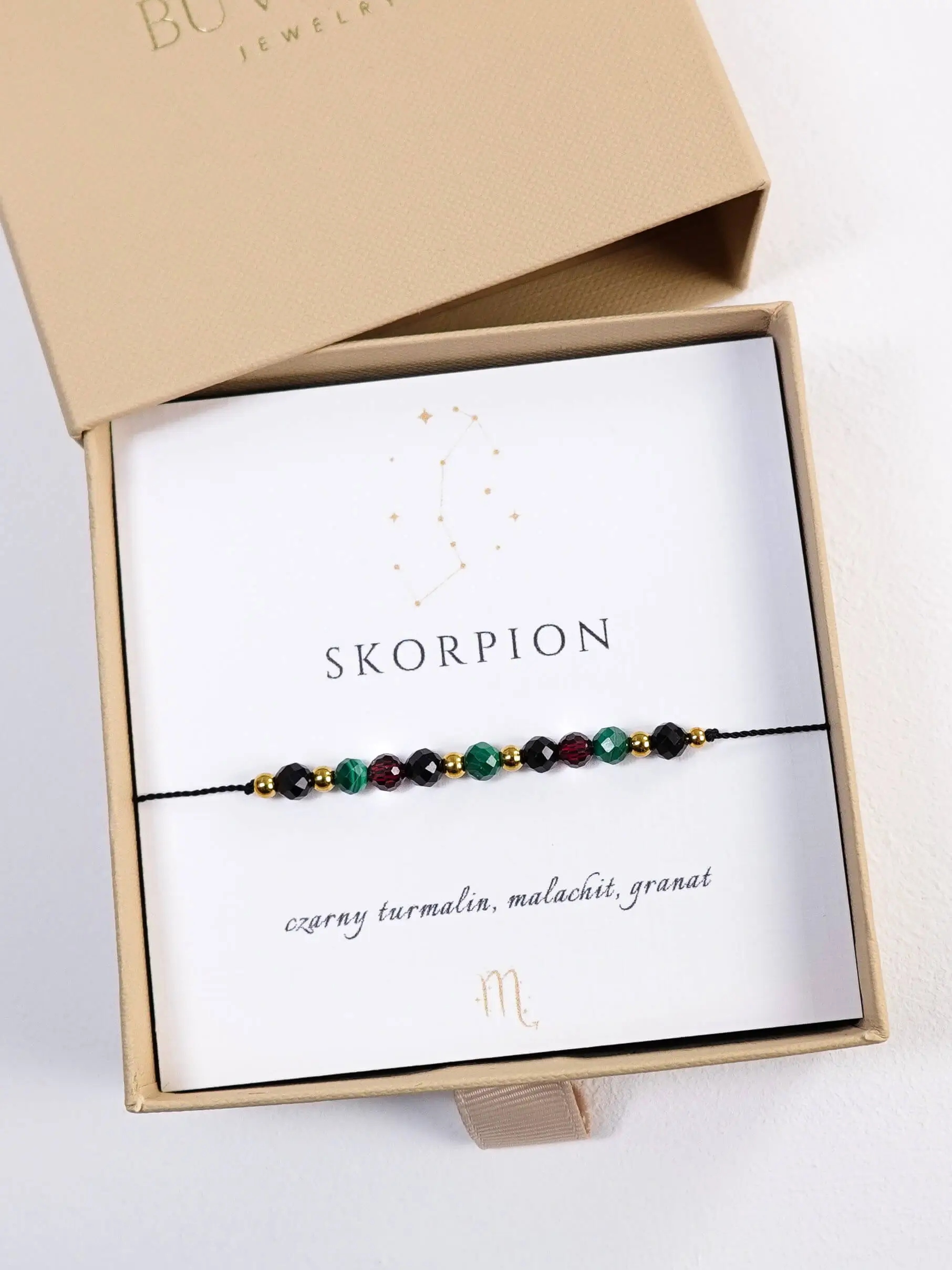 Bransoletka dla znaku Skorpion z kamieni naturalnych: malachitu, ametystu, turmalinu, została zaprojektowana z myślą o osobach o silnej osobowości, głębokiej intuicji i magnetycznej energii.