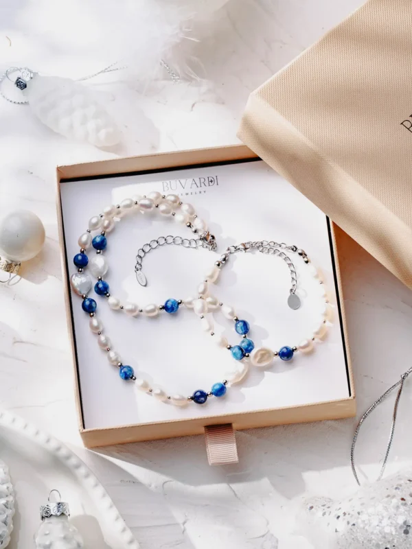 Naturalne perły zachwycają swoim ponadczasowym światłem, a kianit wprowadza chłodny, szlachetny akcent inspirowany grudniową aurą. Dzięki temu komplet „Winter Blue” staje się zarówno piękną ozdobą codziennych stylizacji, jak i wyjątkowym wyborem na świąteczne okazje.
